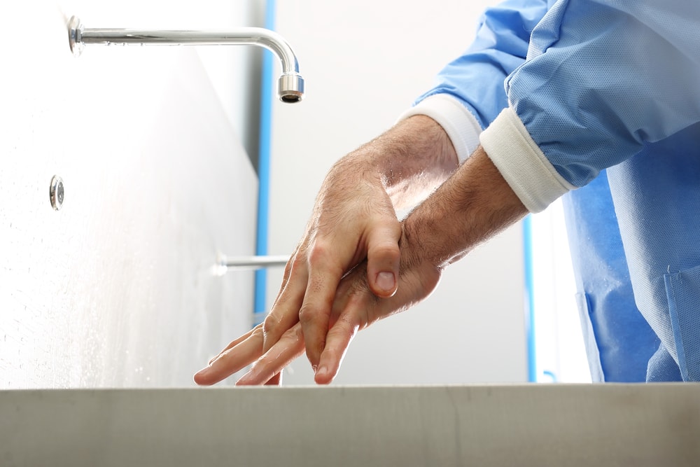 É importante que o álcool esteja disponível em todo o hospital, para a desinfecção das mãos de colaboradores, pacientes e visitantes. Além disso, nos banheiros deve haver sabonete líquido e papel toalha, para que a higienização seja sempre realizada. É interessante, ainda, afixar placas nos banheiros com instruções sobre como lavar as mãos de maneira correta. Isso é muito importante porque as mãos são grandes transmissoras de bactérias que causam infecções.